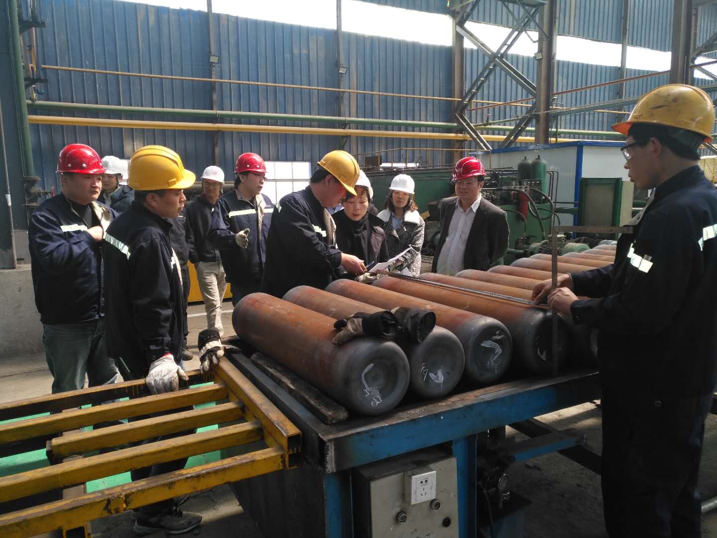 AP公司专家就宽城天海生产的的产品规格、技术参数、工艺指标做了详细的了解,并就产品的型式实验、取证和投产等工作的时间线达成初步共识。随后专家组一行参观了宽城天海冲拔瓶车间、管制瓶车间和冷加工车间。